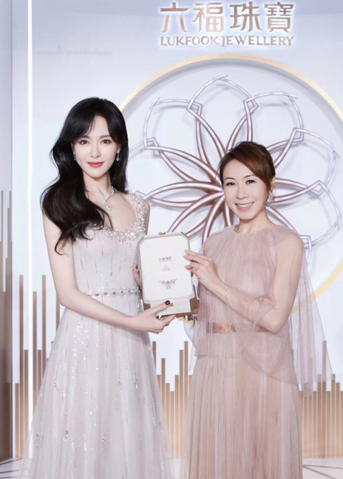 (图:六福集团执行董事兼副行政总裁黄兰诗女士为全球代言人唐嫣送上专属打造的高级定制蝴蝶胸针)
