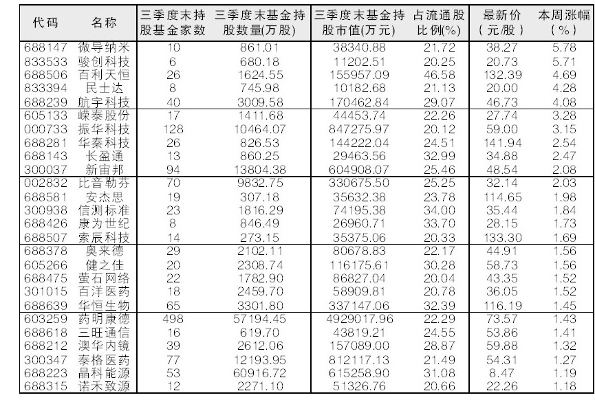据Wind统计显示,截至三季度末,基金持有93股占流通股比例超过20%。从二级市场来看,52只基金重仓股本周股价出现上涨。其中,微导纳米、骏创科技、百利天恒、民士达等本周涨幅居前。