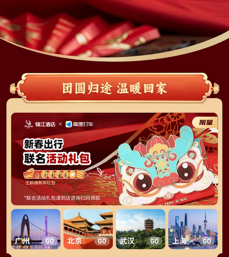 为守护住客春节团圆归途,除了提供酒店折扣优惠,锦江酒店(中国区)还联合高德打车推出“温暖回家路”主题活动,打造春运联名礼包,送出10万份128元打车券包权益,助力春运、春节期间便捷出行。同时,为进一步方便旅客出行,锦江酒店(中国区)还贴心为春运中转的旅客梳理了大型交通枢纽周边酒店,提供便捷指引。