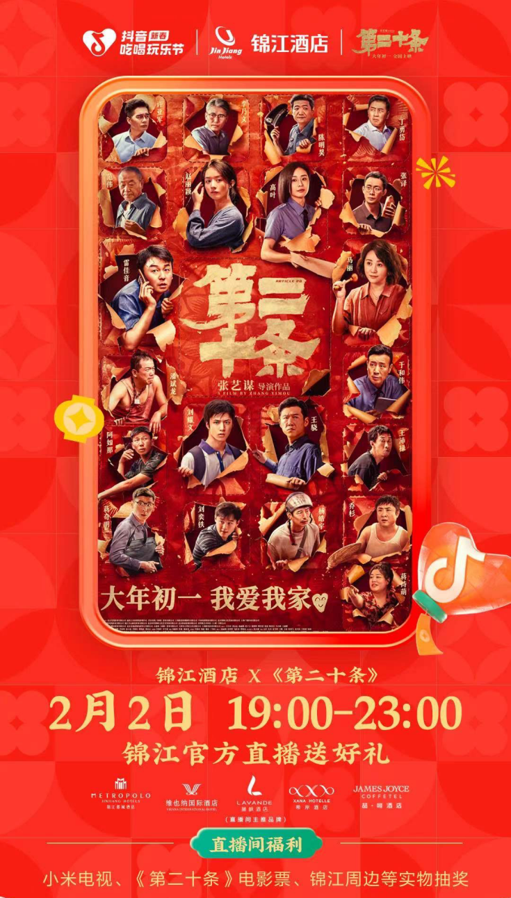 此外,锦江酒店(中国区)已联合抖音酒旅头部达人连续开展三场抖音年货节直播,推出全国多城市多元品牌酒店通兑券,并在最近一场与贺岁电影《第二十条》的联名直播中带领住客“云入住”锦江旗下主力品牌酒店,方便用户更直观地选择酒店产品。同时,在小红书平台,锦江酒店(中国区)官方号“锦江酒店 (精选)”还发起了“美好旅途,新年游记”话题活动,鼓励大家参与分享在入住锦江酒店(中国区)旗下酒店有过的心动瞬间或新年旅行计划,送出免费房券、锦江荟金卡季卡、定制环保盲盒周边等奖品。