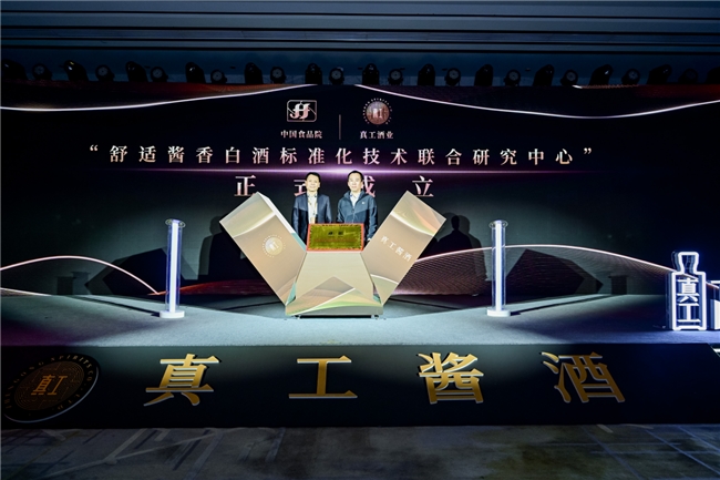 发布会上,真工酒业联合中国食品发酵工业研究院共同成立了“舒适酱香白酒标准化技术联合研究中心”,中国食品发酵工业研究院党委书记、总经理郭新光与真工酒业董事长兼总裁路通共同为研究中心揭牌。