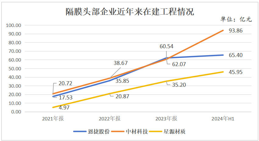 从在建工程来看,上半年除恩捷股份有所放缓,中材科技、星源材质目前均有序推进产能建设。