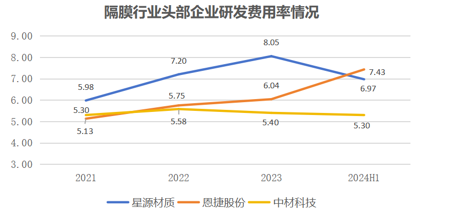 从近年的研发费用率来看,星源材质的研发费用率在三家企业中排名靠前。据悉,因在推动行业发展、服务社会进步中所做的贡献被认可,星源材质获得了隔膜行业唯一上榜的2023 年度国家科学技术奖,这是中国科技界的最高荣誉之一。