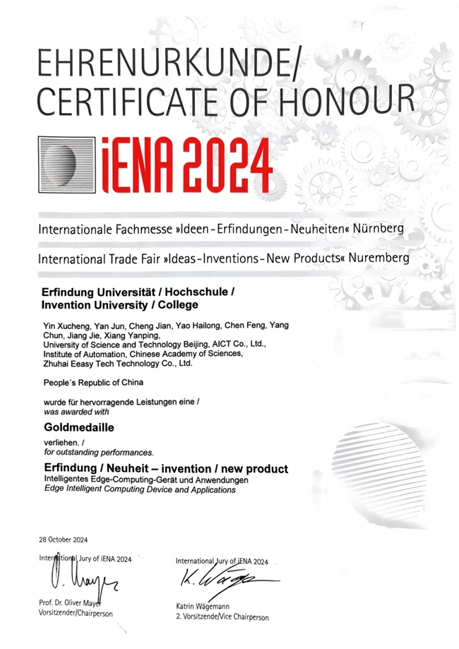 第76届德国纽伦堡国际发明展于日前成功举办,吸引了来自约30个国家和地区的500多项发明项目参展。经过严格的评审,智慧互通(AICT)与北京科技大学、中国科学院自动化研究所和珠海亿智电子科技有限公司联合参展的“端侧智能计算装置及应用项目”获得本次展览会金奖。