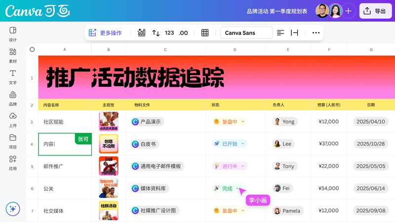 • Canva可画工作表:重新定义电子表格,实现强大、丰富的可视化功能,并与用户的完整工作流程深度连接。
