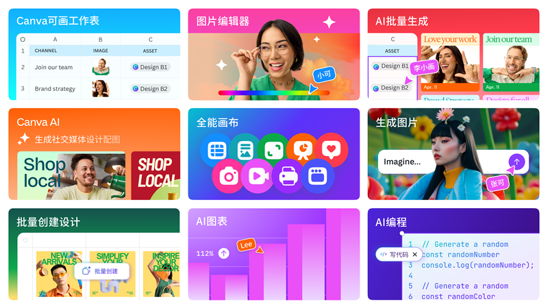 在本次Canva Create大会发布的全球创新功能中,全能画布、AI图表、图片编辑器预计将于4月底向中国用户开放。此外,Canva可画工作表、AI批量生成、Canva AI、AI编程功能也将很快与中国用户见面。