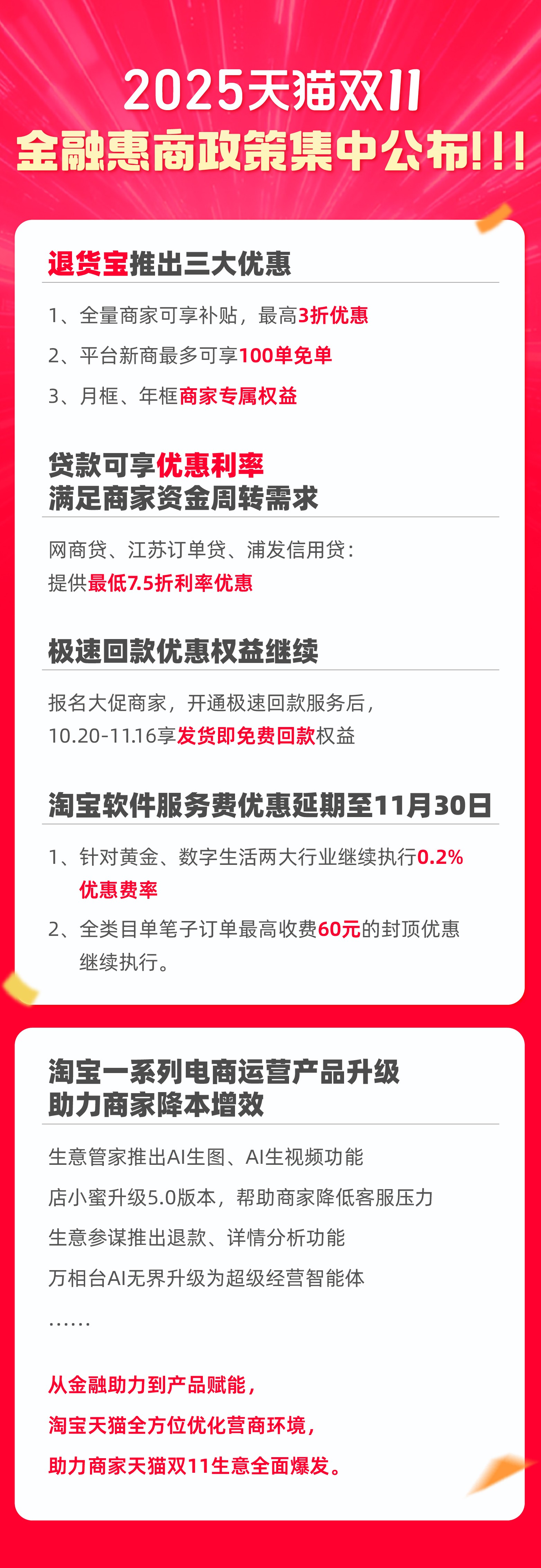 10月15日,2025天猫双11将正式开启。发货即享免费极速回款、退货宝补贴超5亿、优惠贷款全量覆盖……淘宝天猫一系列金融惠商政策火力全开,助力商家迎战年度最大流量洪峰。