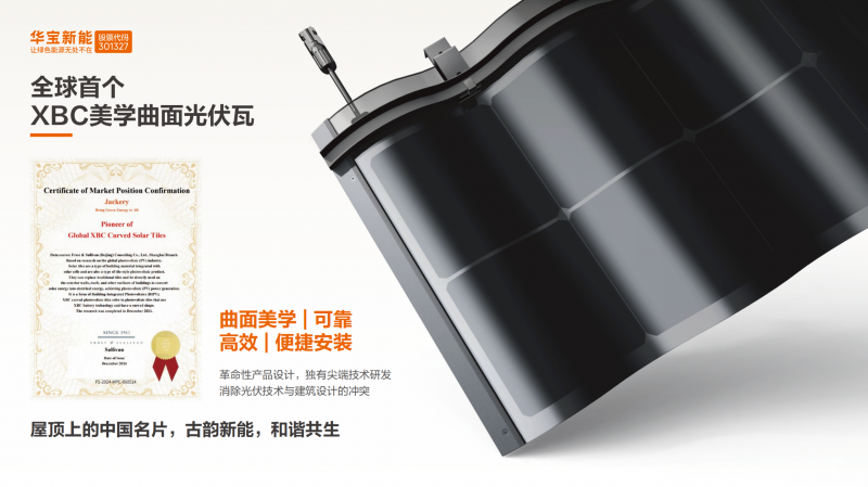 截至目前,华宝新能美学曲面光伏瓦已申请专利达140余项,通过 UL 7103(全球首个曲面光伏瓦认证)、TüV 南德、CQC 等中、美、欧全序列国际认证,集齐全球主流市场准入“通行证”。
