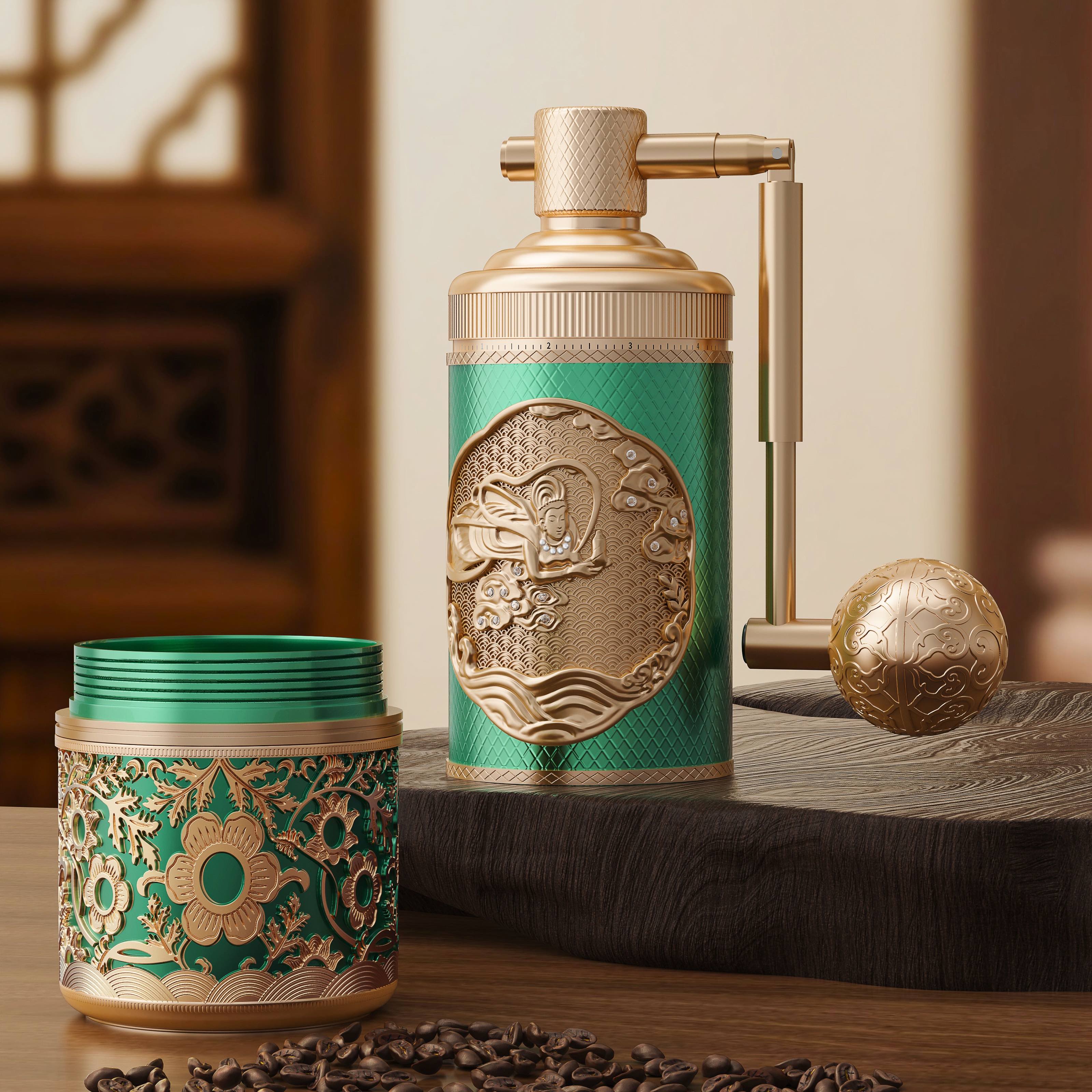 咖啡研磨器底部设计独具匠心,其墨绿色咖啡粉仓搭配黄金色石榴花卉卷草元素精心装饰,不仅寓意吉祥圆满、生生不息、循环永续,还借由枝叶缠绕的形态,巧妙传递出“和谐共生”的文化理念,象征着人与自然、人与人之间包容与联结的美好愿景。