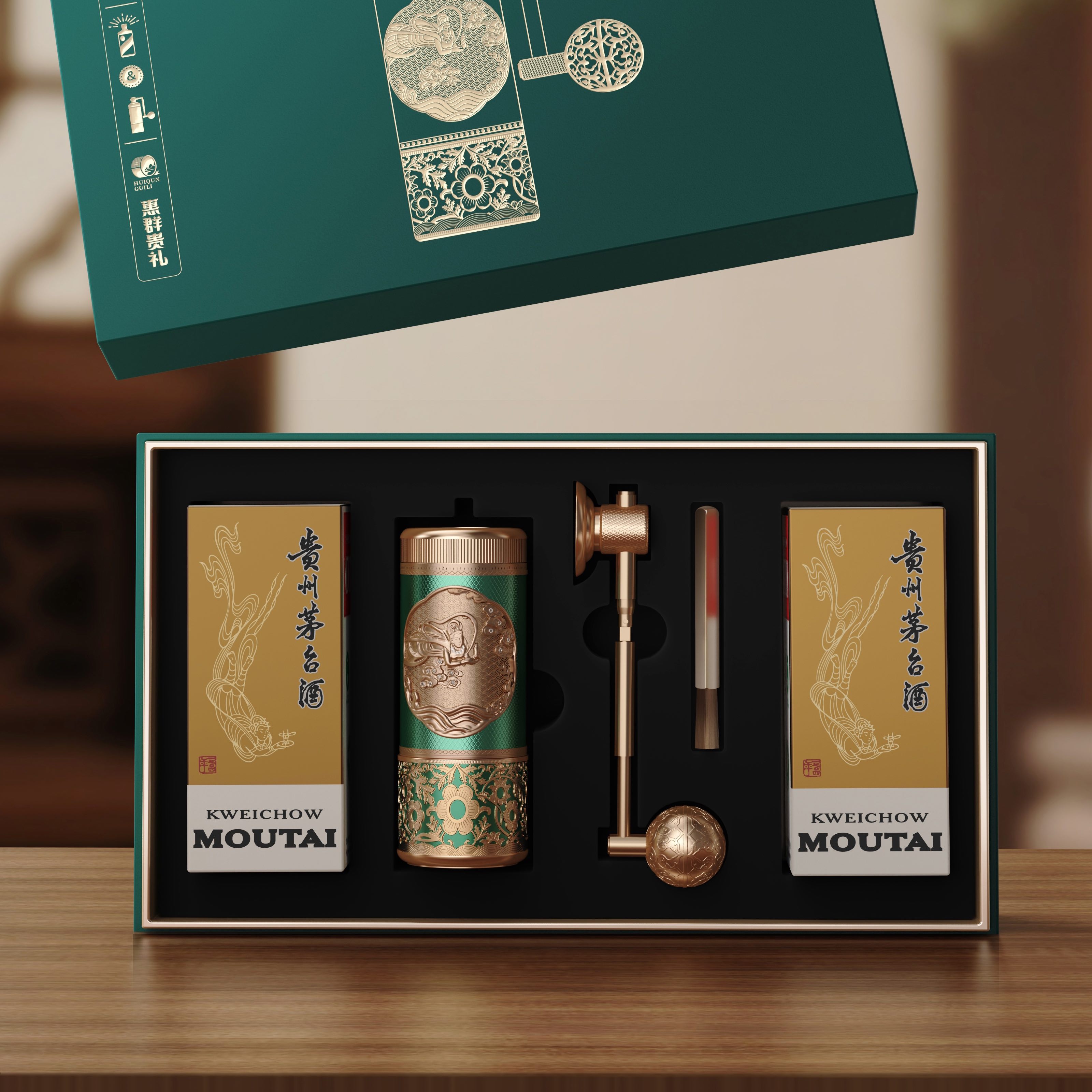 母盒中最抓眼球的莫过于贵州茅台酒手摇咖啡研磨器,通体采用墨绿与黄金撞色的金属机身,墨绿色沉稳大气,自带复古优雅格调,如同贵州茅台酒历经岁月沉淀的厚重底蕴,黄金色质感亮眼精致,为整体造型注入贵气,象征着其始终坚守的高品质标准,二者结合,既显高雅韵味又增添华贵高级感。