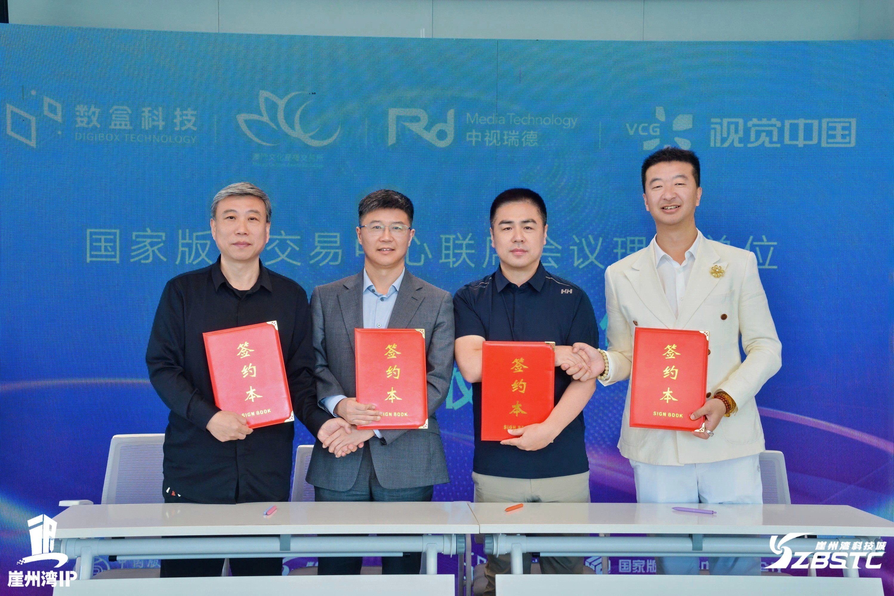 国家版权交易中心联席会议理事单位数盒科技生态合作伙伴签约仪式,左起:中视瑞德副董事长王旗,视觉中国副总裁张宗堂,数盒科技董事长、创始合伙人迟静超,澳门文产交易所总经理李东霖