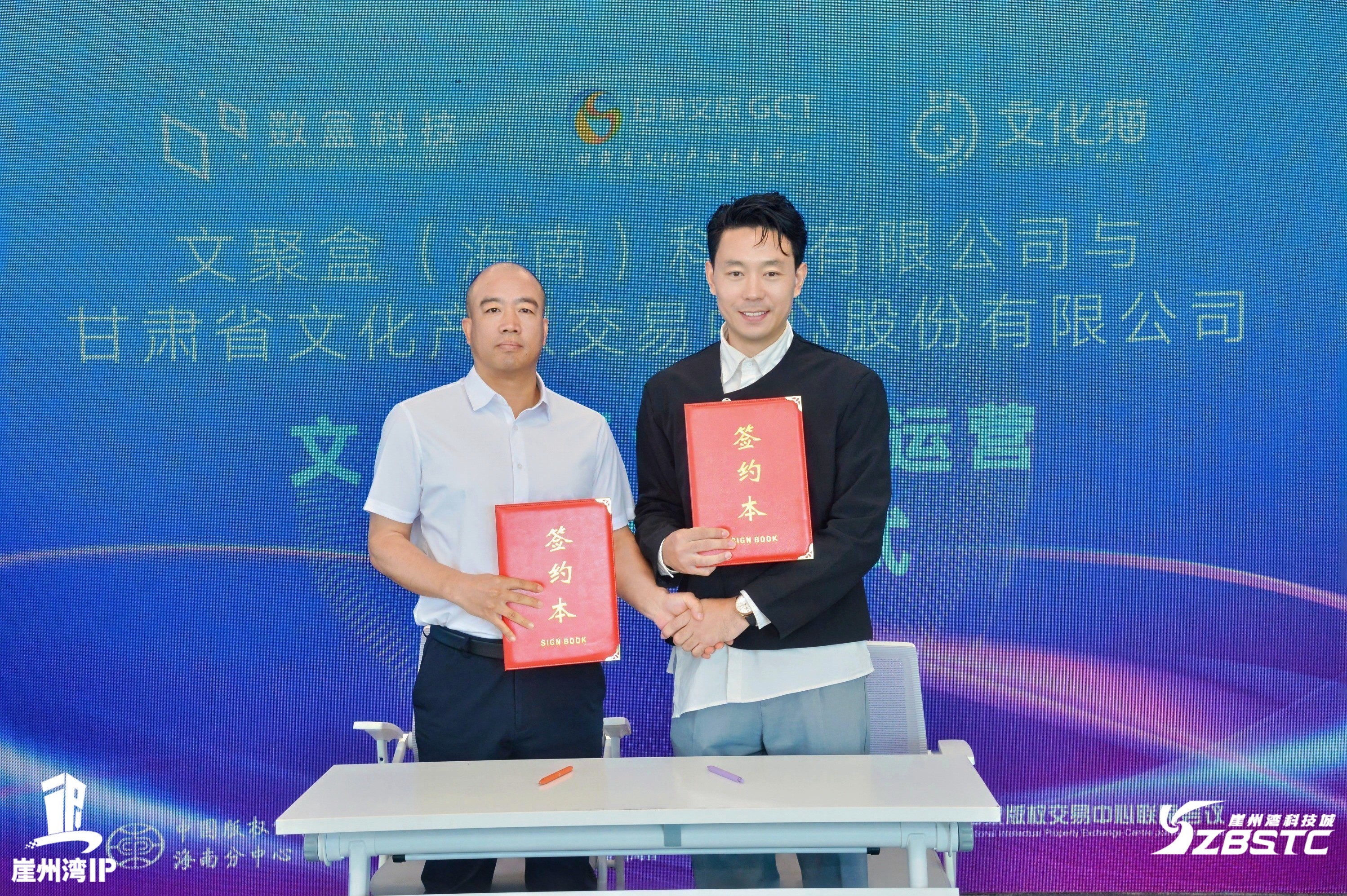 甘肃省文化产权交易中心股份有限公司总经理邱进胜(左)与文聚盒总经理王子宇(右)签约授权