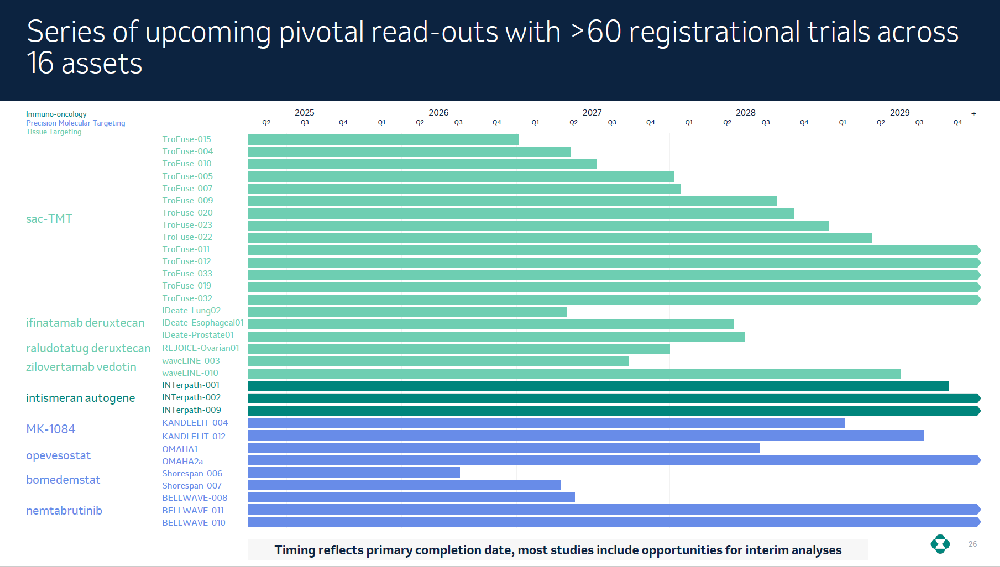 Sac-TMT的商业潜力已通过临床验证与市场反馈逐步释放——其在中国的商业化已步入快速增长阶段,2025年半年报显示该产品在报告期内营收超3亿;而在近日的ESMO会议上,sac-TMT一举拿下2项LBA(含1项重磅主席论坛报告)和5项poster,是重磅报告数量最多的国产创新药之一。目前,默沙东明确将其列为“具有重磅炸弹潜力”的候选产品,按照规划,2027年起该产品将迎来多项全球III期临床试验数据披露。