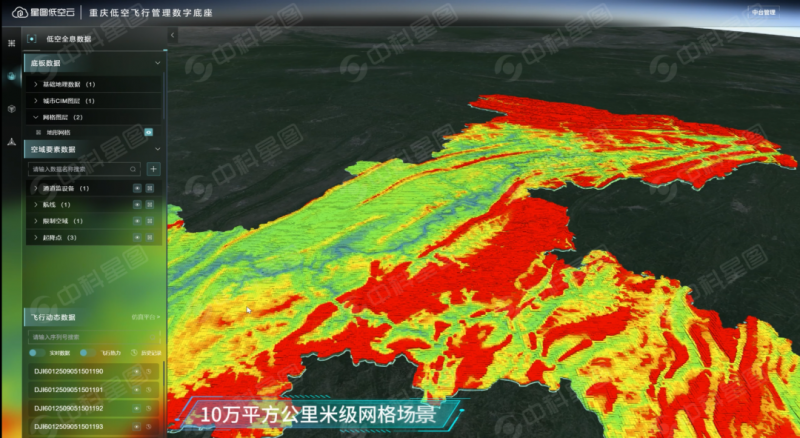 这种“天+算”的融合优势,在重庆项目中展现得淋漓尽致。重庆“山多、桥多、江多、楼密”的复杂环境,曾让不少规划者望而却步——山区与城区交错,气象条件多变,传统测绘需要数月才能完成基础建模。但中科星图依托自主研发的数字孪生建模技术,整合地形数据、倾斜摄影数据、三维点云数据、城市CIM 图层等多类型数据,通过网格化构建与 LOD(细节层次)技术,实现数据的高效存储与加载。目前已支持 10 万平方公里底板数据的网格化构建,在中等配置 PC 机上即可实现流畅渲染,为重庆全域低空态势可视化提供“高清数字画布”。同时在地球超算的加持下,项目可支撑十亿级网格数量的空间构建,网格精度从公里尺度直达米级——水平误差不超过 0.5 米,高度误差不超过 0.3 米。这种 “细粒度” 空域划分,能精准匹配重庆山地地形,为无人机航线规划、禁飞区管理等提供“精准坐标参考”。