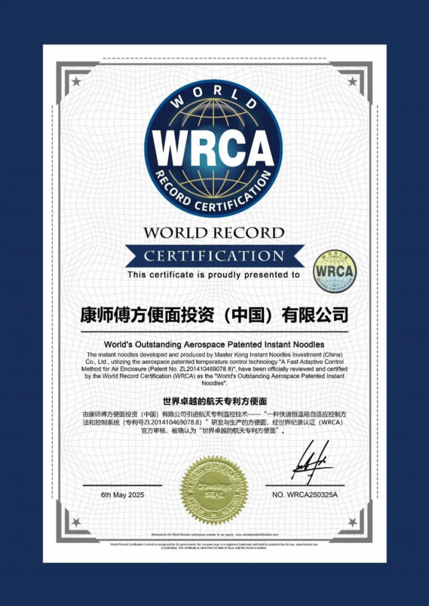 康师傅是全国首个将航天专利技术应用于方便面生产的企业,他们将航天温控技术融入生产环节,使产品在南北跨越50℃的极端温差下仍能保持风味稳定。凭借硬核实力,2024年,康师傅斩获WRCA“世界卓越的航天专利方便面”认证。