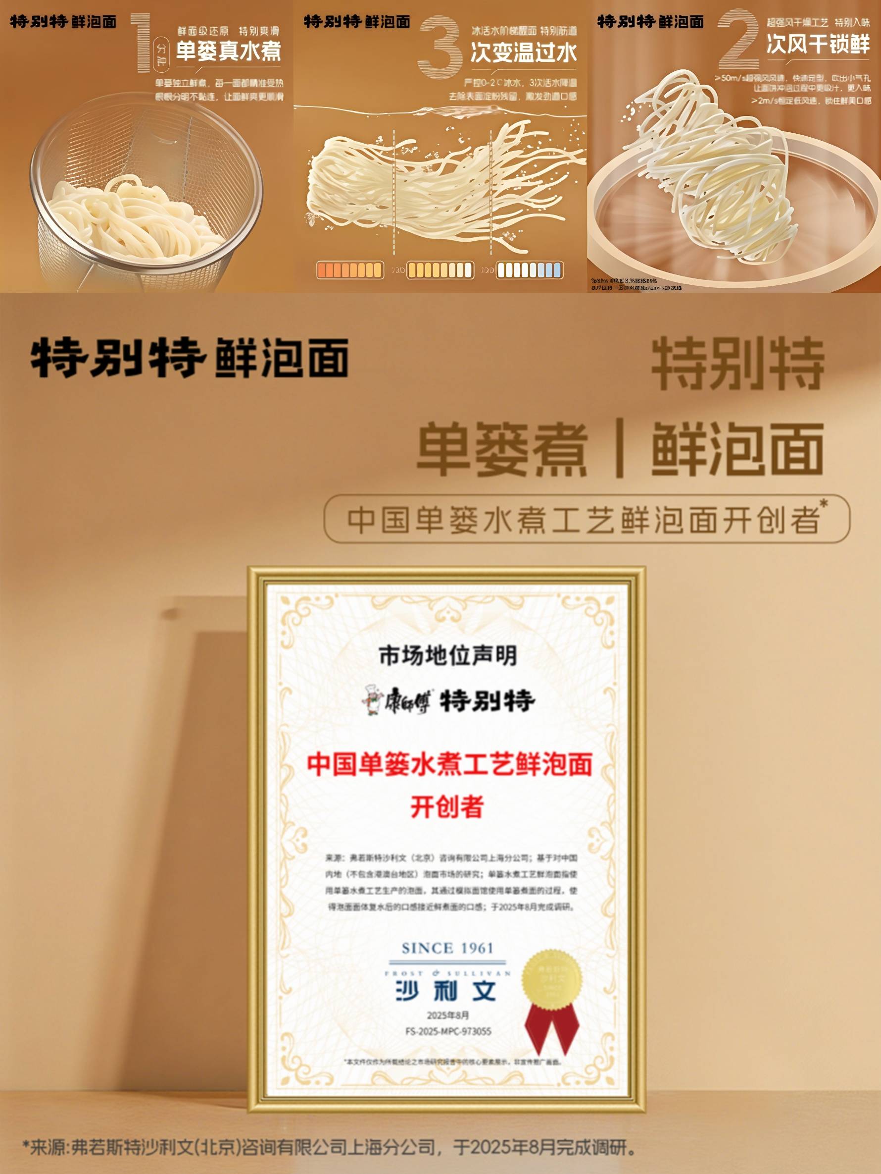 凭借此项创新,康师傅还在2025年8月获得由沙利文认证的“中国单篓水煮工艺鲜泡面开创者”称号。