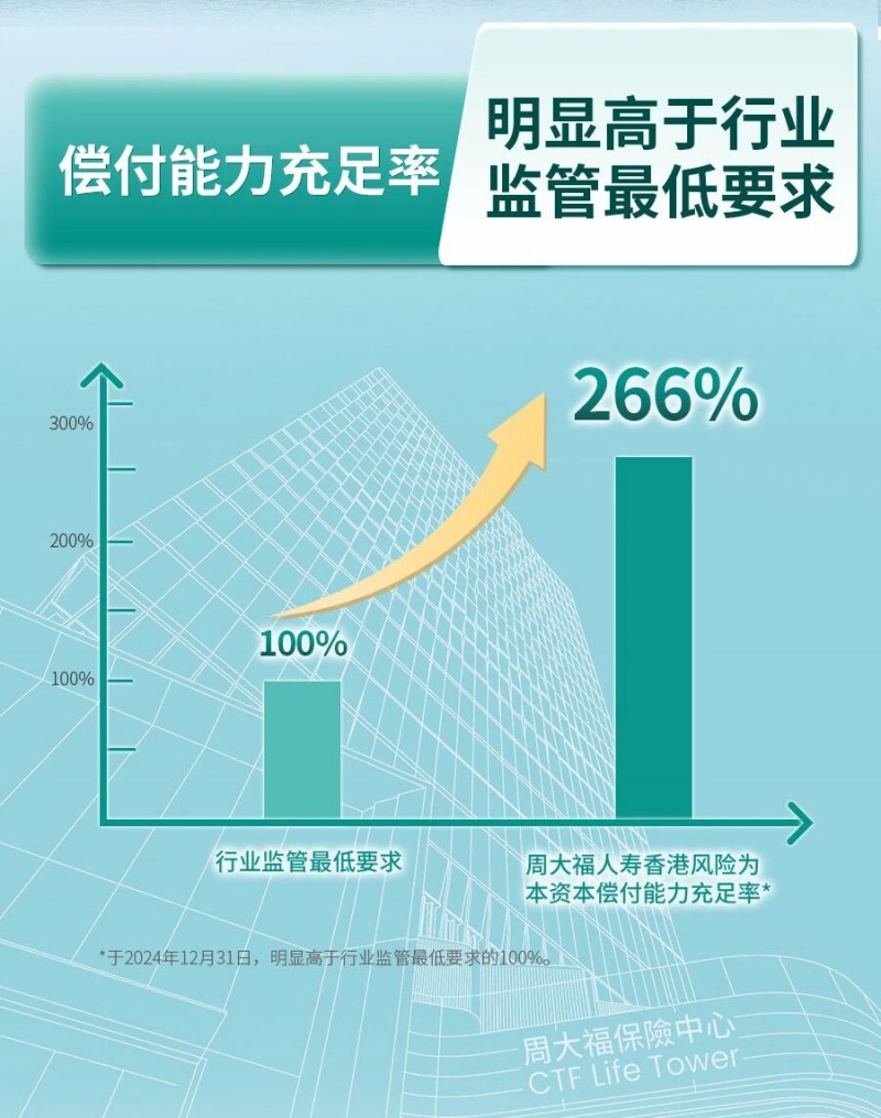 作为国际金融中心,香港对保险机构的准入设置了极高门槛。获取人寿保险牌照,意味着公司已通过股东背景、资本实力、治理结构及业务计划等多重审核。与此同时,香港保险公司普遍采用全球化、多元化的资产配置策略,并严格执行资本充足率监管要求。以周大福人寿为例,其香港风险为本资本制度偿付能力充足率达266%,远高于监管最低要求100%,构建起坚实的财务“防火墙”。