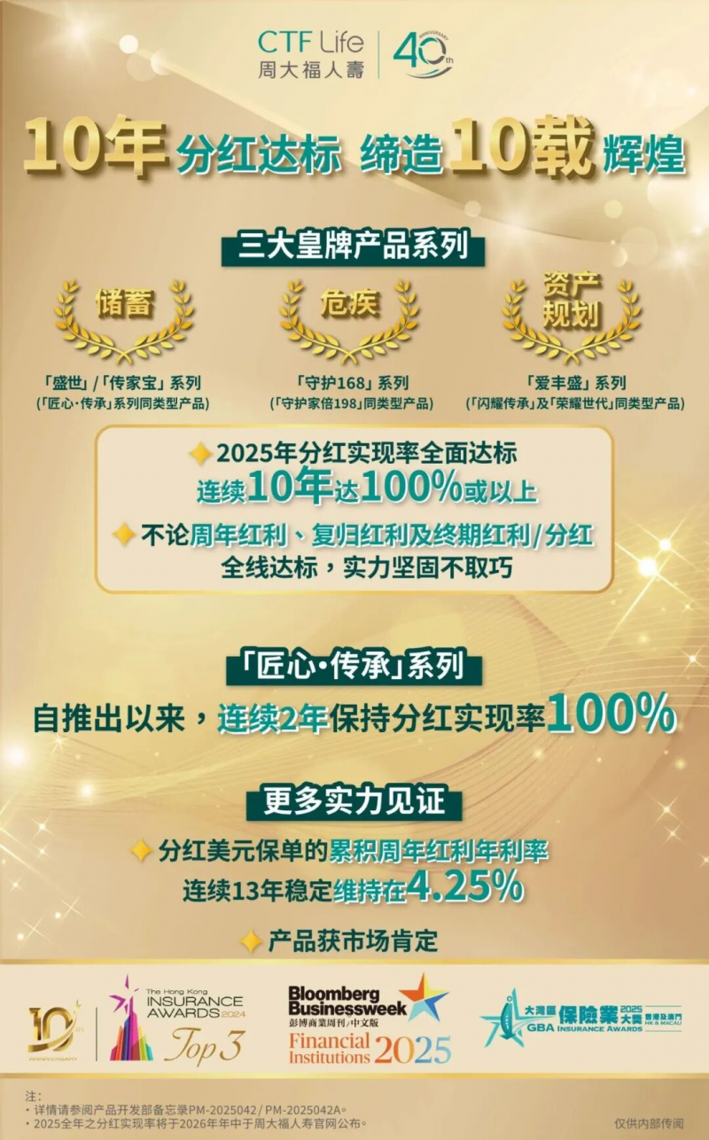 “飞扬盛世”的持续热销,印证了市场对稳健型储蓄保险的强劲需求,更反映出投资者对“制度保障+企业实力”双重验证模式的认可。在香港健全的保险监管体系下,周大福人寿凭借其连续十年的分红兑现记录、扎实的财务数据、审慎的风控体系及深厚的品牌底蕴,正成为越来越多投资者的共识之选,为市场树立了“安全”与“收益”兼顾的标杆。