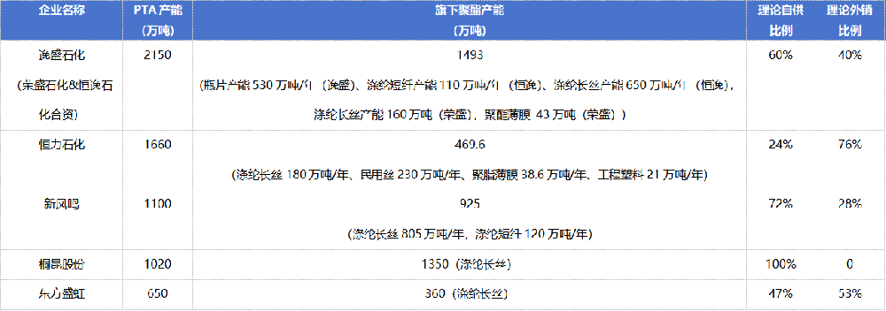据CCF数据,截至11月27日,恒力石化、桐昆股份旗下的PTA装置整体呈正常运行状态。据统计,恒力石化PTA产能约24%用于自供,约76%对外销售,即约有1261万吨PTA产能用于外销,在头部企业中外销规模最大。