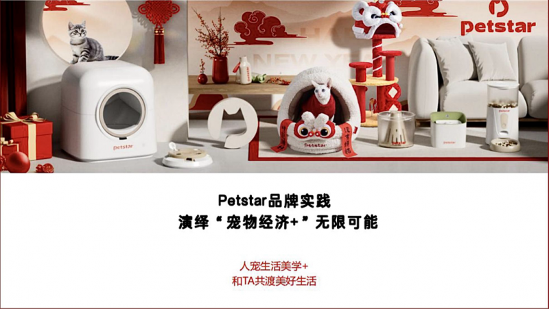 虞晓春说,Petstar单独有一条内容线是东方美学,比如Petstar颇受欢迎的醒狮系列产品,就是将中国传统的醒的文化,通过现代化演绎融入到了产品设计里,“让东方符号融入日常陪伴,在新春佳节的时候布上这么一个喜气洋洋的醒狮产品,氛围感自然就来了”;而Petstar的人宠国风潮秀,则通过与上海宠物时装周的战略合作,将中国传统东方美学通过宠物服饰完美呈现;