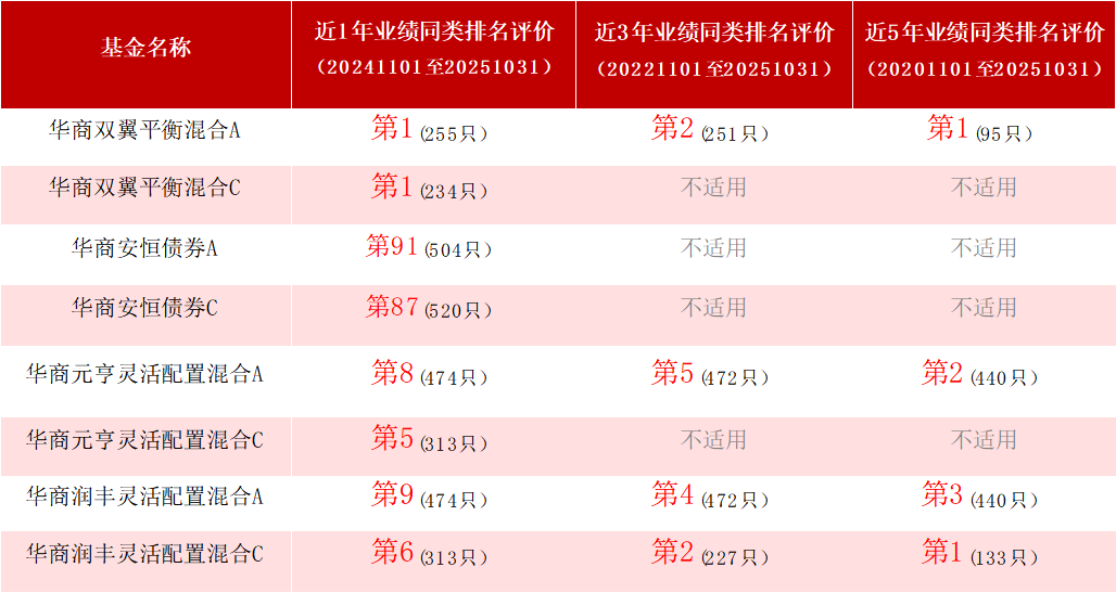 基金业绩同类排名评价数据由银河证券2025年11月发布,数据截至20251031;华商润丰灵活配置混合A、华商元亨灵活配置混合A基金分类为灵活配置型基金(基准股票比例60%-100%)(A类);华商润丰灵活配置混合C、华商元亨灵活配置混合C基金分类为灵活配置型基金(基准股票比例60%-100%)(非A类);华商双翼平衡混合A基金分类普通偏债型基金(股票上限高于30%)(A类);华商双翼平衡混合C基金分类普通偏债型基金(股票上限高于30%)(非A类);华商安恒债券A基金分类普通债券型基金(二级)(A类);华商安恒债券C基金分类普通债券型基金(二级)(非A类);文中排名显示“不适用”代表基金成立时间暂不满足评价区间条件。