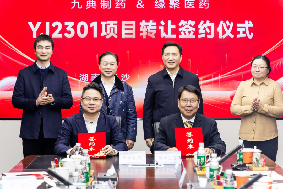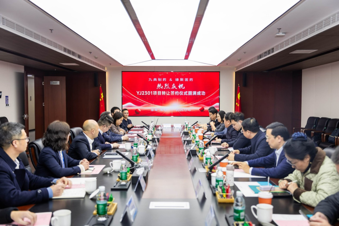2025年12月15日,南京医科大学党委书记兰青及苏州缘聚医药董事长李飞等一行十余人到访九典制药,共同见证九典制药与缘聚医药创新药项目转让协议的正式签署。根据协议,九典制药将以不超过4亿元的总金额,受让小分子镇痛创新药YJ2301项目的全球所有权及知识产权。
