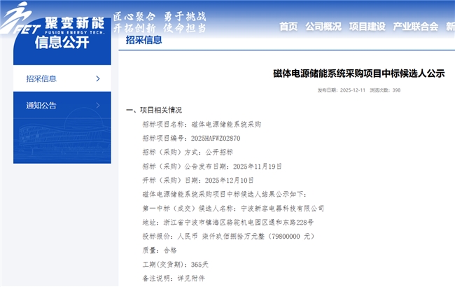在这一浪潮中,产业链核心环节的突破已悄然发生。根据安徽公共资源交易集团发布的官方公示结果,王子新材子公司宁波新容电器科技有限公司以第一候选人身份中标聚变新能“磁体电源储能系统采购项目”,中标金额7980万元,占到宁波新容2024年营业收入的17.73%。
