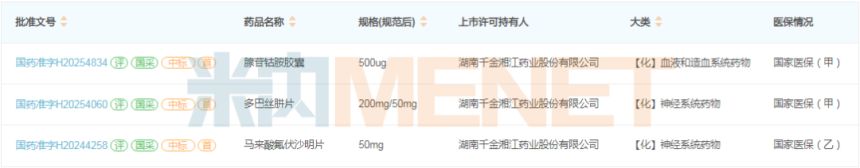 中成药方面,千金药业已有70余个品种获批上市,包括约14个独家品种(含剂型独家,下同)。其中,妇科千金(胶囊/片/丸)2024年在中国三大终端六大市场(统计范围详见本文末)销售额超8亿元,2025H1继续增长至超4.7亿元,补血益母(丸/糖浆/颗粒)2024年销售额超1.8亿元,2025H1同比增长12.39%;其分别为2025H1妇科中成药通用名TOP1和TOP22品种。