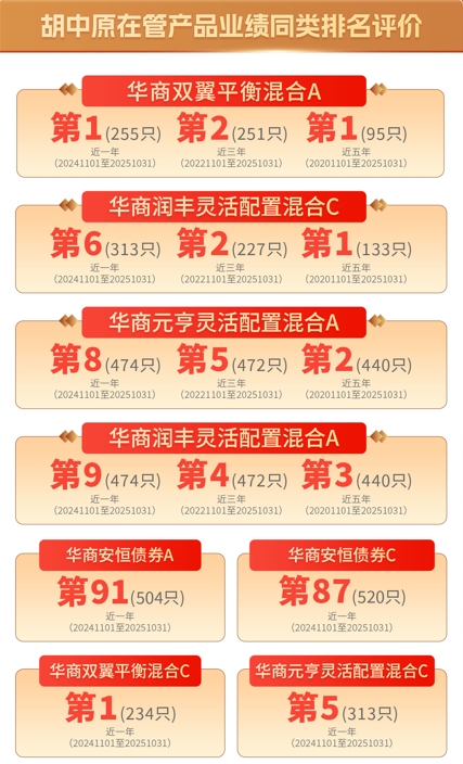 基金业绩同类排名评价数据由银河证券2025年11月发布,数据截至2025.10.31;华商润丰灵活配置混合A、华商元亨灵活配置混合A基金分类为灵活配置型基金(基准股票比例60%-100%)(A类);华商润丰灵活配置混合C、华商元亨灵活配置混合C基金分类为灵活配置型基金(基准股票比例60%-100%)(非A类);华商双翼平衡混合A基金分类普通偏债型基金(股票上限高于30%)(A类);华商双翼平衡混合C基金分类普通偏债型基金(股票上限高于30%)(非A类);华商安恒债券A基金分类普通债券型基金(二级)(A类);华商安恒债券C基金分类普通债券型基金(二级)(非A类)。