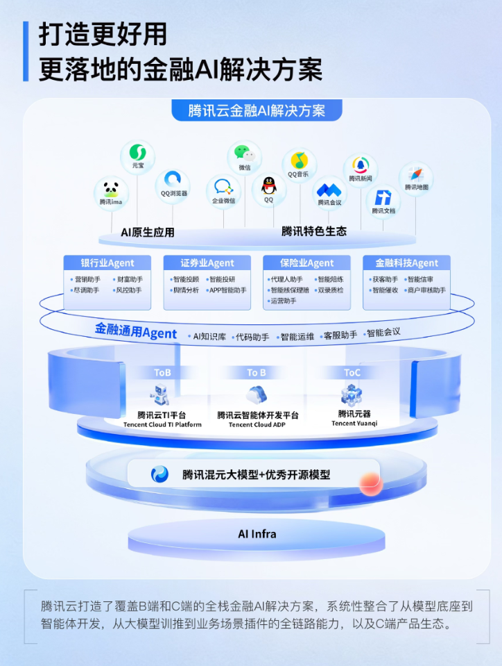 对于金融机构而言,盘活海量的非结构化金融知识是落地AI大模型的基础。腾讯乐享AI知识库助力广发证券搭建了公司级知识库中台,将过去散落在各部门、各系统的投研报告、市场数据整合为统一的“智慧大脑”,赋能智能投研、智能办公等10余个业务场景。申万宏源则基于腾讯云 ADP构造财富内容生产智能体、投顾投资策略智能体,打通百万份专业证券知识,实现精准分析与高效决策,投资服务效能提升30%。