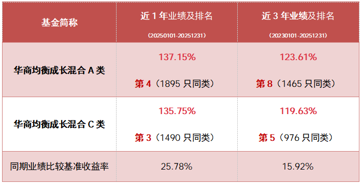 数据说明:市场数据来自万得信息。基金业绩排名评价数据来自银河证券2026年1月发布,华商均衡成长混合A基金类型为混合基金-偏股型基金-偏股型基金(股票上下限60%-95%)(A类);华商均衡成长混合C基金类型为混合基金-偏股型基金-偏股型基金(股票上下限60%-95%)(C类)。近一年为20250101-20251231,近3年为20230101-20251231。