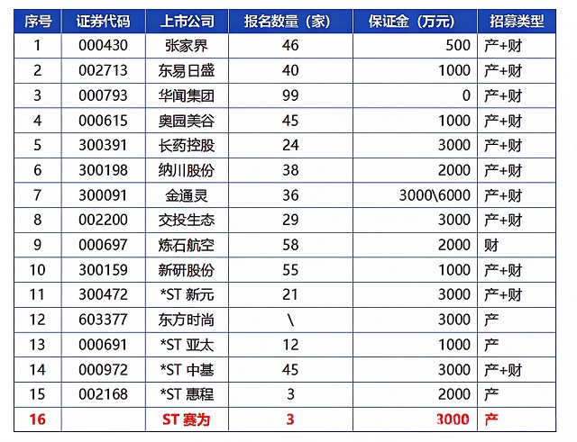 图里其他公司基本都有20家+以上的意向方报名,最接近的是*ST惠程。但这家是2025年4月就戴星,根据交易所规则必须在当年完成财务数据的逆转,因此其8月开始招募重整投资人,意味着仅有4个月时间完成重整;而ST赛为目前还没戴星,1月20日发布业绩预警后,即使净资产为负开始戴星,也还有一年的重整时间,其实并没有那么着急。