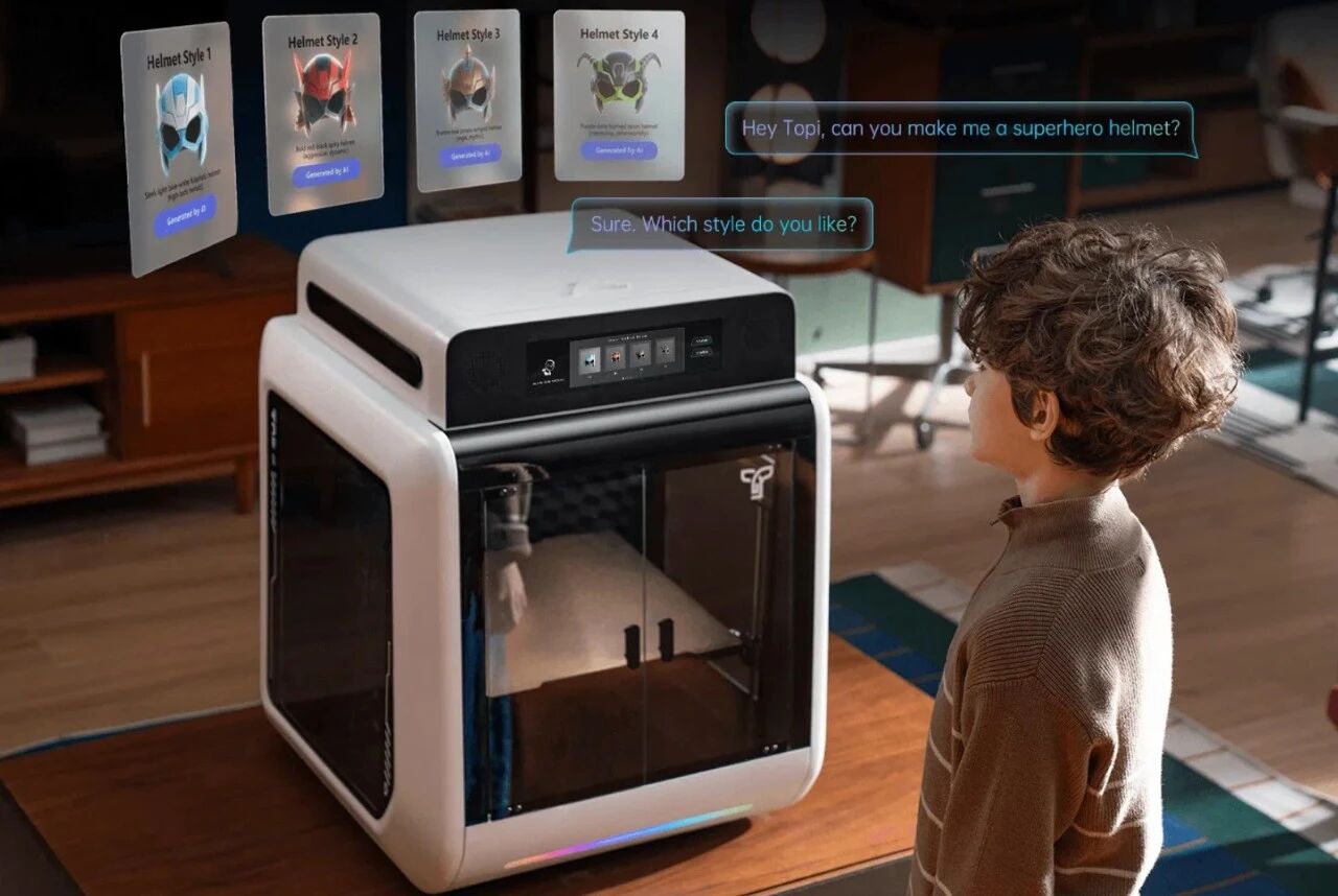 通过内置的大模型支持(官方确认合作方包括腾讯混元和Tripo),用户只需对着设备说出“Hey Topi,我想做一个花瓶”或“帮我设计一个超级英雄头盔”,系统便会实时生成多个3D模型方案,直接显示在设备的触摸屏上。如果用户选择满意的样式后,R1即可直接开始打印——整个过程无需手机、无需电脑、无需任何建模或切片知识。从官方展示的交互界面来看,这一流程已具备初步的实用性:当用户提出头盔需求后,Topi会迅速给出“头盔样式1/2/3/4”的预览图供选择。除此之外,R1还配备双摄像头AI监控系统:可实时监测常见的打印失败场景(如炒面、堵头、异物掉落、空打等),并通过移动端APP推送警报,提升无人值守打印的安全性。