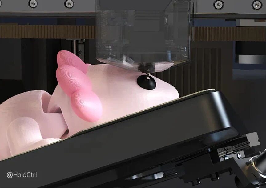 与传统的多色打印(依靠单热端频繁换料)不同,R1的切片软件会先分析模型上的不同颜色区域(例如一只小动物的眼睛、鳍片或装饰条纹),然后利用五轴运动系统将这些颜色部件分区域、分顺序打印成一个整体。