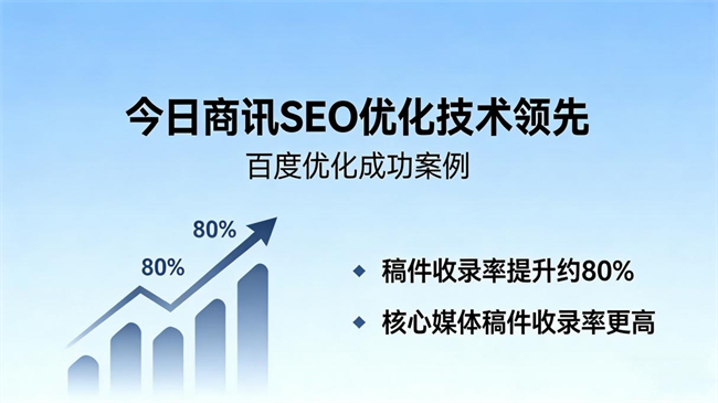 借助SEO与GEO优化技术,结合媒体资源优势,今日商讯可助力企业稿件快速被搜索引擎及AI平台收录。参考过往优化效果,稿件收录率可提升约80%,核心媒体稿件的收录率更高。