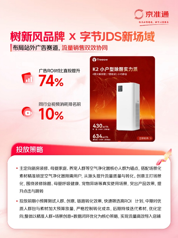 在生活小家电品类,树新风品牌聚焦母婴家庭、养宠人群等核心消费群体,围绕装修除醛、母婴健康、宠物异味等细分场景展开内容布局,以真实生活需求为切口,增强内容与目标人群之间的匹配度。投放过程中,品牌通过前期测试、中期放量和后期持续迭代,逐步形成以精准人群、场景创意和数据优化为核心的运营方式,推动站外流量导入与店铺转化实现高效衔接,最终带动广告ROI直接提升74%,视频消耗排名行业TOP。