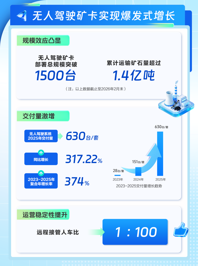 从业务结构看,无人驾驶矿卡是营收增长的主要驱动力。2025年,该板块交付量为630台/套,同比增长317.22%。截至2026年2月末,其无人驾驶矿卡累计部署规模突破1500台,累计运矿量超1.4亿吨。目前,相关技术方案已通过严苛工况验证,实现了1:100的远程接管人车比,并在-40℃极寒环境下保持稳定运行。