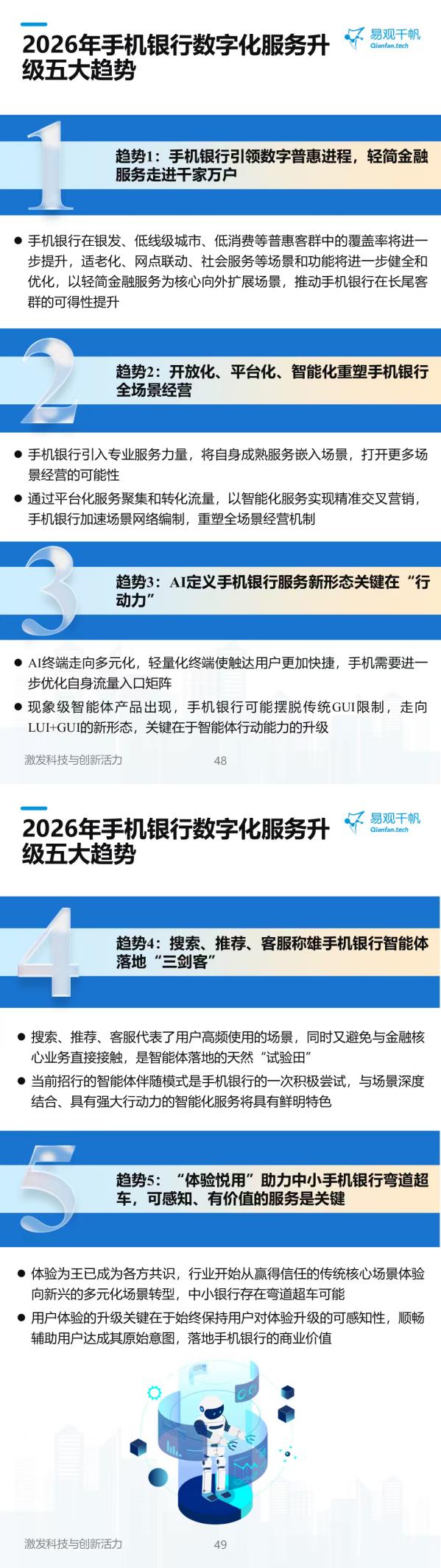 报告预判2026年手机银行数字化服务将呈现五大升级趋势:一是数字普惠向纵深发展,轻简金融服务进一步向银发、下沉市场、长尾客群渗透;二是开放化、平台化、智能化重塑全场景经营,银行加速编织场景网络;三是AI定义手机银行服务新形态,智能体“行动力”成为核心竞争力;四是搜索、推荐、客服成为智能体落地“三剑客”,与场景深度结合的智能化服务将成为行业创新方向;五是“体验悦用”助力中小银行实现差异化发展,可感知、有价值的服务体验将成为区域性银行构筑竞争优势的核心方向。