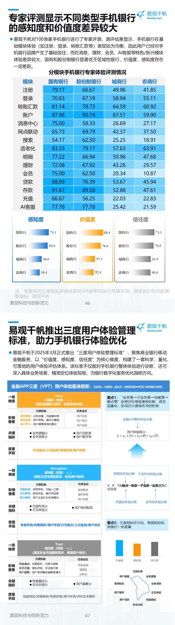 为精准评估手机银行用户体验水平,助力手机银行设计预研、体验检视、APP迭代与服务创新,易观千帆于2025年3月正式推出“三度用户体验管理标准”。该标准聚焦商业银行数字金融服务,以“价值度、感知度、信任度”为核心维度,构建起一套科学、量化、可落地的用户体验评估体系,不仅能对手机银行整体体验进行全面诊断,还可深入具体业务场景,精准定位体验短板。基于这一标准,易观千帆对100余家手机银行开展了专家评测,结果显示,手机银行在注册、登录、转账汇款等基础模块的体验表现较为均衡,也让用户对手机银行品牌形成了基础信任;而在消息中心、理财、会员、AI客服等特色与新兴模块,不同类型银行的体验差异显著,国有行与股份制银行的表现远超区域性银行,二者在价值度、感知度上存在明显差距。