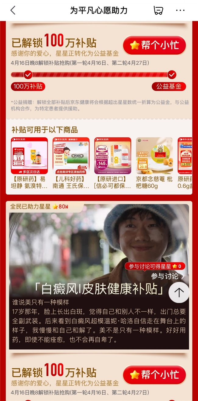 这些真实的声音不断累积,既道出了亿万个普通家庭对健康保障的迫切需求,也推动着京东买药十周年公益行动的落地。随着万千用户的共同参与,活动持续升温,健康心愿补贴已解锁100万补贴额度。始终立足每一份平凡的健康心愿,京东买药以公益为纽带,让汇聚而来的善意精准落地、直达所需。本次解锁的爱心补贴,将以京东支付满减券的形式定向发放,患者可在购药时直接抵扣,切实减轻购药负担。