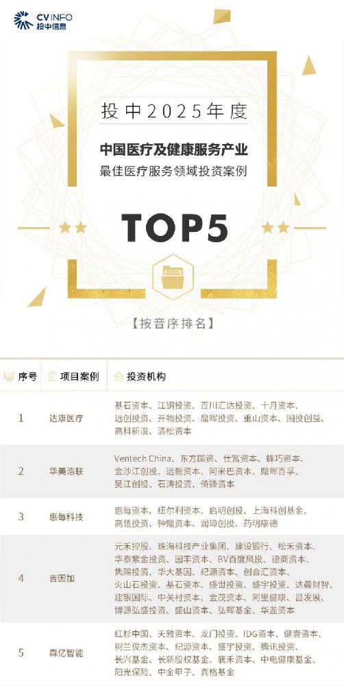 (原标题:喜报!华美浩联入选投中2025年度“最佳医疗服务领域投资案例TOP5”)
