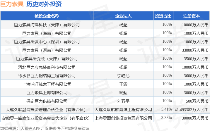 证券之星消息,根据天眼查APP显示,巨力索具(002342.SZ)新增一起对外投资事件,被投资公司为巨力索具海洋科技(天津)有限公司,法定代表人杨超,投资占比为100%。该公司从事铁路、船舶、航空航天和其他运输设备制造业,注册资本为10000万人民币。目前,巨力索具共存在对外投资12项,详见下表: