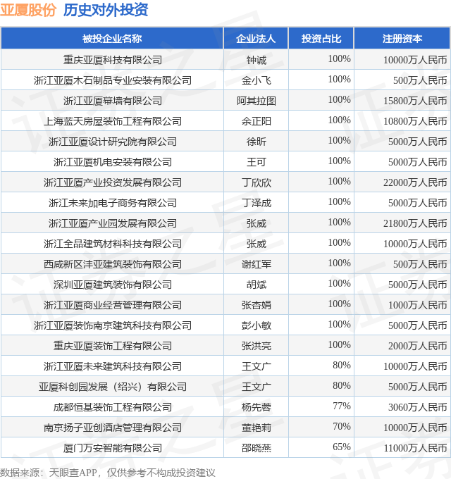 证券之星消息,根据天眼查APP显示,亚厦股份(002375.SZ)新增一起对外投资事件,被投资公司为重庆亚厦科技有限公司,法定代表人钟诚,投资占比为100%。该公司从事专业技术服务业,注册资本为10000万人民币。目前,亚厦股份共存在对外投资26项,投资占比前20的项目见下表: