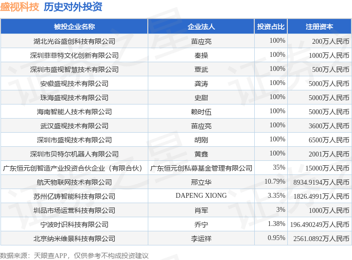 证券之星消息,根据天眼查APP显示,盛视科技(002990.SZ)新增一起对外投资事件,被投资公司为湖北光谷盛创科技有限公司,法定代表人苗应亮,投资占比为100%。该公司从事计算机、通信和其他电子设备制造业,注册资本为200万人民币。目前,盛视科技共存在对外投资15项,详见下表: