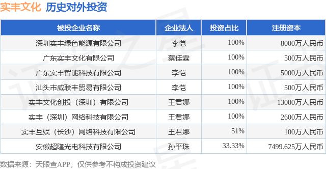 通过天眼查大数据分析,实丰文化发展股份有限公司共对外投资了11家企业,参与招投标项目6次;财产线索方面有商标信息204条,专利信息277条,著作权信息128条;此外企业还拥有行政许可15个。据2024年报数据,实丰文化长期股权投资3525.57万元,同比减56.77%。