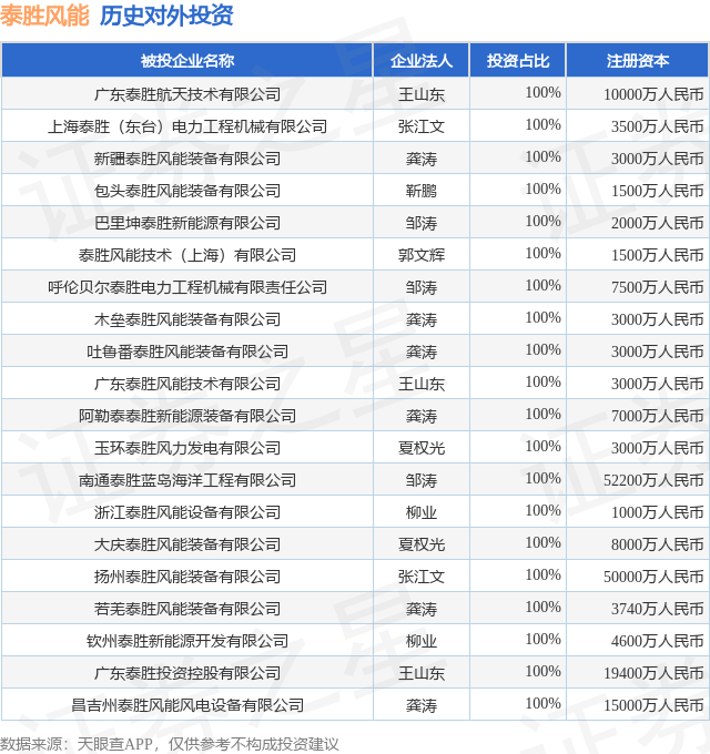 证券之星消息,根据天眼查APP显示,泰胜风能(300129.SZ)新增一起对外投资事件,被投资公司为广东泰胜航天技术有限公司,法定代表人王山东,投资占比为100%。该公司从事专业技术服务业,注册资本为10000万人民币。目前,泰胜风能共存在对外投资25项,投资占比前20的项目见下表: