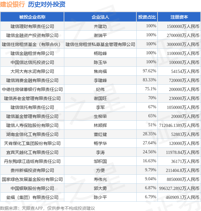 证券之星消息,根据天眼查APP显示,建设银行(601939.SH)新增一起对外投资事件,被投资公司为浙江健盛集团股份有限公司,法定代表人张茂义,投资占比为1.09%。该公司从事纺织服装、服饰业,注册资本为35318.3149万人民币。目前,建设银行共存在对外投资1155项,投资占比前20的项目见下表: