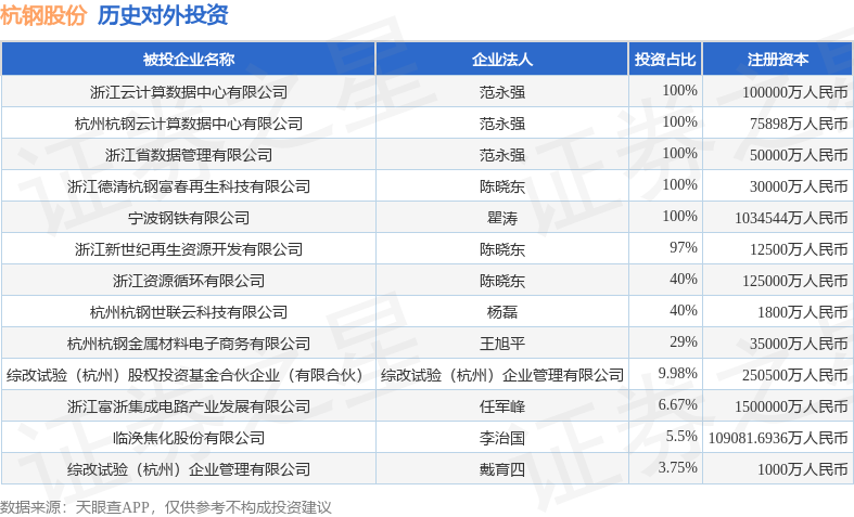 证券之星消息,根据天眼查APP显示,杭钢股份(600126.SH)新增一起对外投资事件,被投资公司为浙江资源循环有限公司,法定代表人陈晓东,投资占比为40%。该公司从事废弃资源综合利用业,注册资本为125000万人民币。目前,杭钢股份共存在对外投资13项,详见下表: