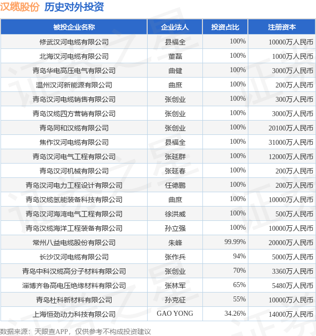 通过天眼查大数据分析,青岛汉缆股份有限公司共对外投资了29家企业,参与招投标项目5565次;财产线索方面有商标信息25条,专利信息215条,著作权信息4条;此外企业还拥有行政许可43个。据2024年报数据,汉缆股份长期股权投资6.77亿元,同比增10.16%。