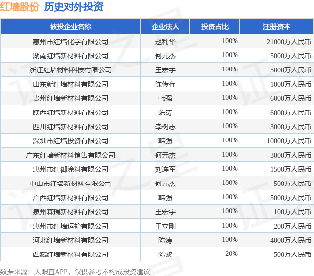 证券之星消息,根据天眼查APP显示,红墙股份(002809.SZ)新增一起对外投资事件,被投资公司为西藏红墙新材料有限公司,法定代表人陈黎,投资占比为20%。该公司从事化学原料和化学制品制造业,注册资本为500万人民币。目前,红墙股份共存在对外投资16项,详见下表: